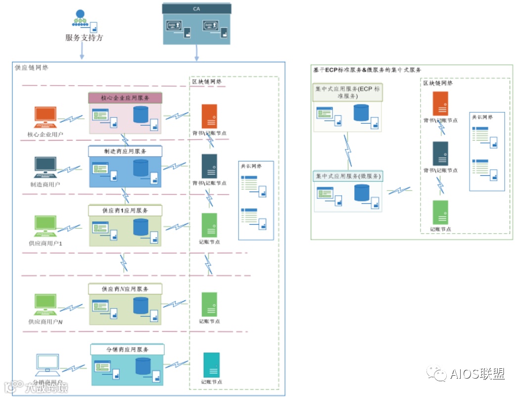 微服务的部署架构包括区块链网络、应用服务、服务支持和CA身份认证4个部分