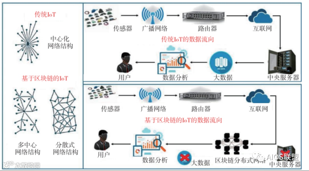 而在基于区块链的物联网中,采用多中心或完全分散式的网络结构: