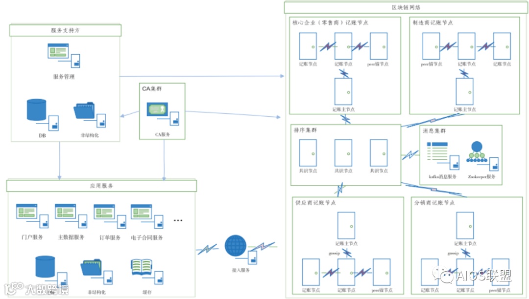 (1)区块链网络:提供统一的区块链服务。网络中核心企业、制造商、供应商、分销商节点体现为角色代表,记账节点不代表具体的参与方。共识节点支持集群部署,记账节点支持动态增加,外部服务通过统一区块链接入服务进行系统交互。