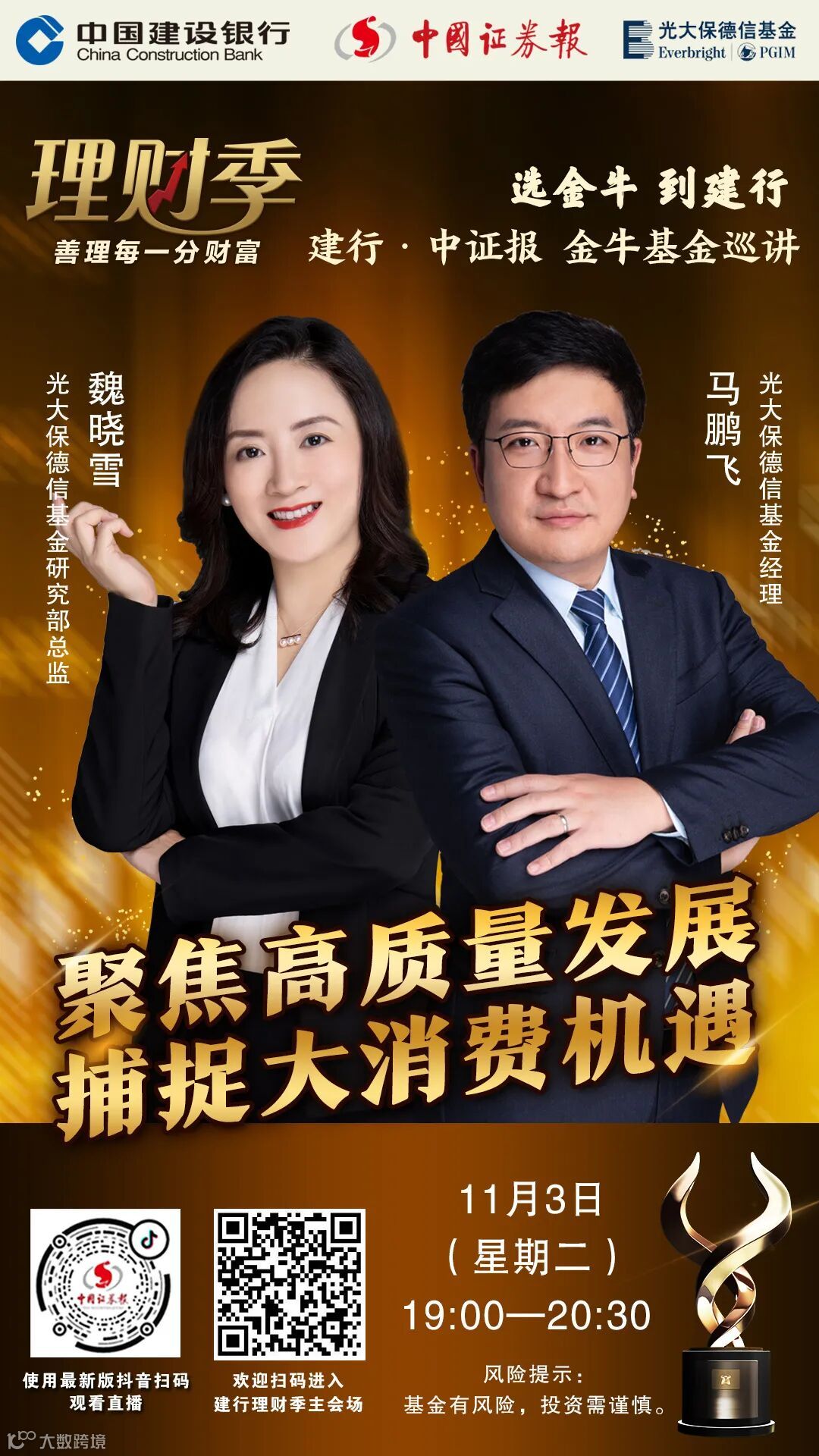 “双十一”来袭,消费板块怎么掘金?三季报密集发布,如何捕捉优质公司?11月3日(本周二)晚7点,光大保德信基金经理马鹏飞和光大保德信基金研究部总监魏晓雪在中证报抖音直播间等你,参与互动还有机会赢取屏显充电宝!使用最新版抖音扫下方海报中的二维码即可观看直播!不见不散!
