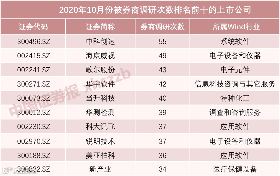 中科创达在10月份共接待55家券商调研,在被券商调研上市公司中位居第一;排名第二的是海康威视,共被49家券商调研;歌尔股份则接待了43家券商调研,排名第三。