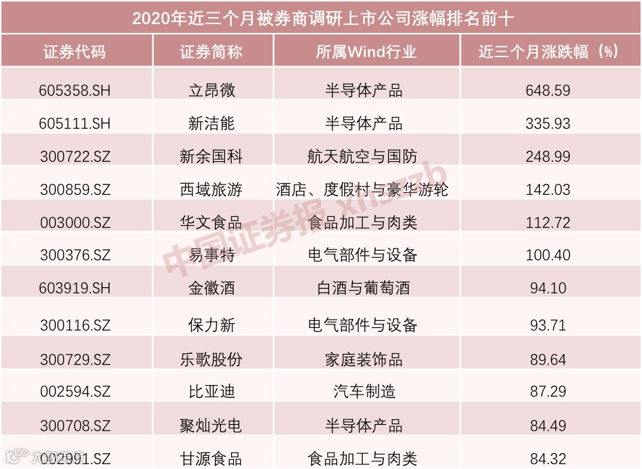 梳理发现,近三个月来被券商调研个股中超过三分之一股价上涨,最高涨幅近650%。