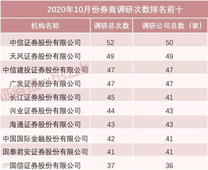 10月调研上市公司次数较多的券商,中信证券排名第一,调研总次数为52次;天风证券排名第二,调研总次数为49次;中信建投和广发证券在10月份的调研次数均为47次;长江证券、兴业证券、海通证券、中金公司、国泰君安在10月份的调研次数也超过了40次。