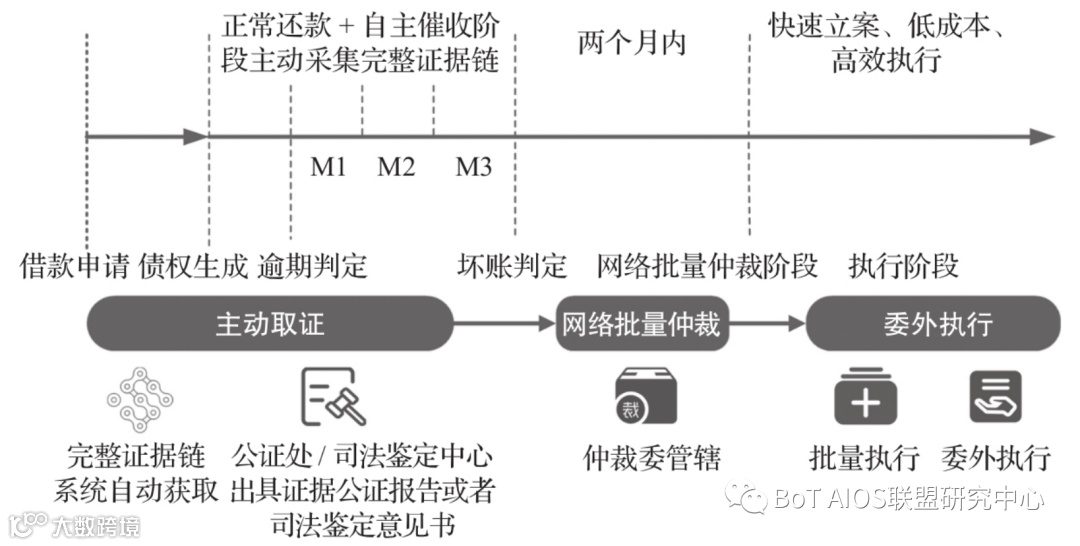 当发生不良贷款时,催收人员只需在后台证据保全系统中点击“一键仲裁”,相应的电子证据就会传输至仲裁委的互联网仲裁平台上。仲裁委收到数据后,与区块链节点存储数据进行校验,在确认证据真实、合法有效后,依据网络仲裁规则依法进行裁决,并出具仲裁裁决书。网络批量仲裁会改变传统司法处置的后置性,将司法处置通道贯穿整个债权周期,并借助互联网的便捷性,提高司法处置效率、降低司法处置成本。