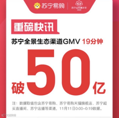 根据苏宁提供的数据,11日0点双11全面开启后,仅用时19分钟,苏宁全场景生态渠道(包含苏宁易购、苏宁易购天猫旗舰店、苏宁易购超级买手直播间、苏宁店播 )GMV破50亿。