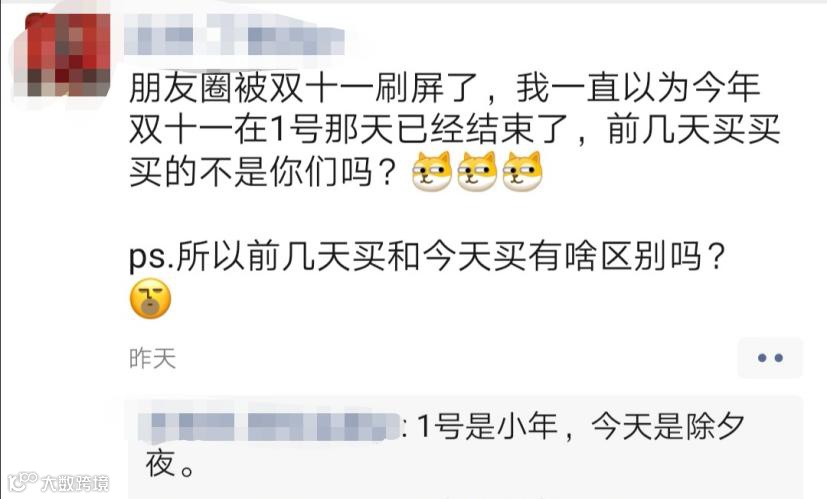 有小伙伴在朋友圈发文:几天前的买买买和今天有啥区别?“1号是小年,今天是除夕夜。”底下回复精辟总结。