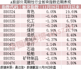 值得注意的是,今日两市顺周期板块涨跌互现,延续了近期以来的分化格局。通达信数据显示,截至今日收盘,有色、钢铁、房地产、银行等12个顺周期行业板块指数中,月内涨幅最大的化纤指数累计大涨24.71%,有色、煤炭指数涨幅超15%;而月内表现较差的矿物制品、建筑、船舶、房地产等行业板块指数,11月以来的涨幅均不足5%。