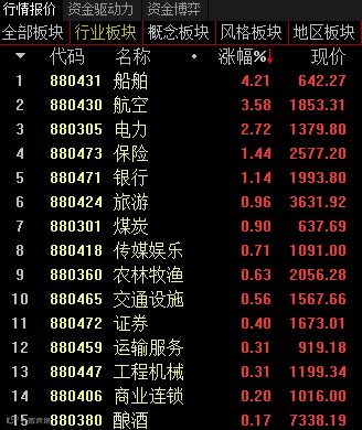 来自光大证券和通达信的数据显示,今日收盘,两市56个行业板块指数21个收红,船舶、电力、银行、煤炭、运输服务、工程机械等多个顺周期行业板块指数涨幅居前。其中,船舶行业板块指数涨4.21%,居第一位。
