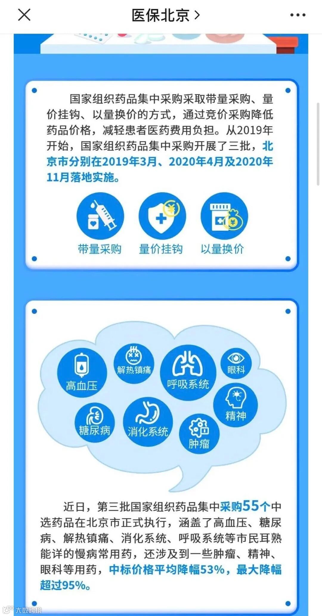 北京医保局官方微信公号“医保北京”11月26日发布消息,第三批国家组织药品集中采购的55个中选药品已在北京正式执行,其中涵盖了高血压、糖尿病、解热镇痛、消化系统、呼吸系统等人们耳熟能详的慢病常用药,还涉及一些肿瘤、精神、眼科等药品,中标价格平均降幅53%,最大降幅超过95%。
