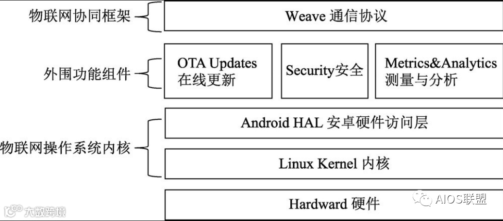 需要说明的是,在谷歌提供的官方架构图中,Weave模块是与OTAUpdates等外围辅助模块位于同一个层次,这样无法反映出Weave和Brillo之间的关系。Weave是依赖于Brillo操作系统而运行的,Weave又不属于Brillo操作系统的范畴。因此应该把Weave放在Brillo上面,既体现了依赖逻辑,又体现了这两者相互独立的关系。
