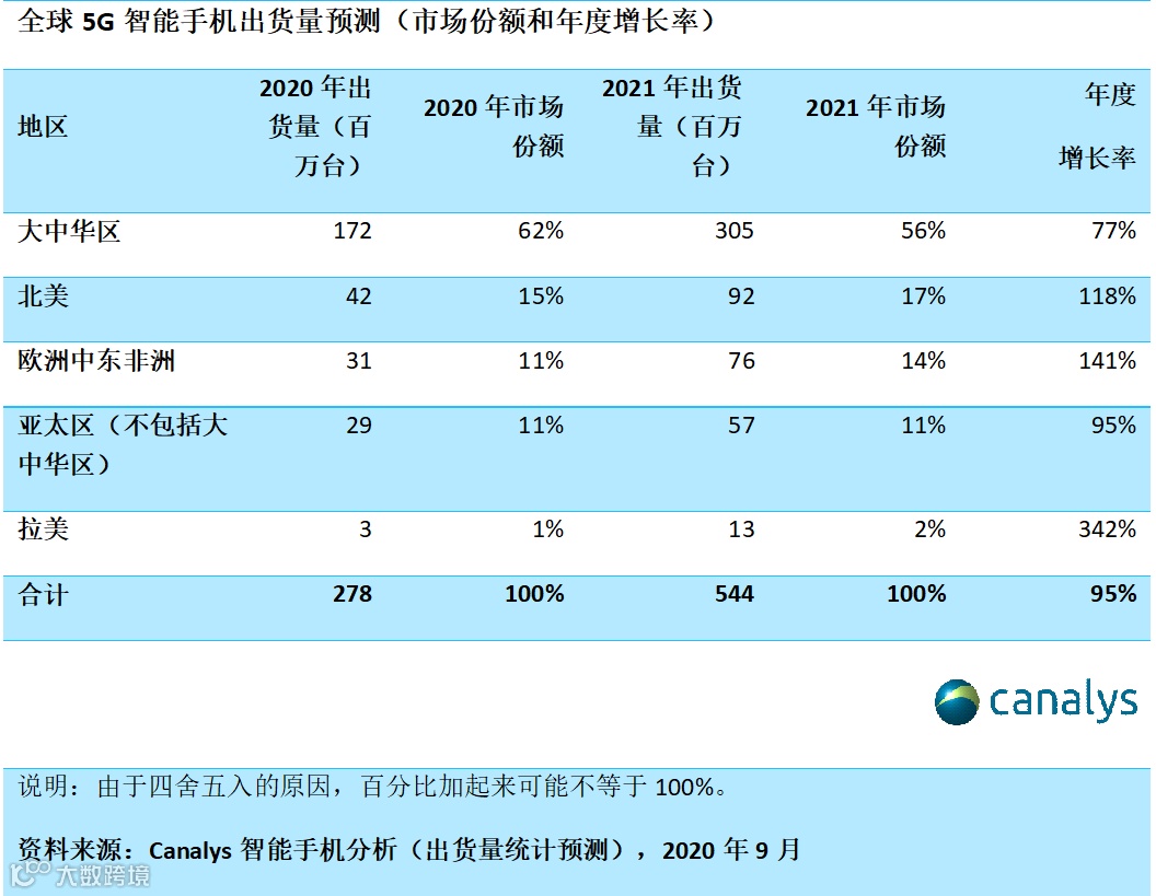 Canalys预测,从2020年全球5G手机出货量来看,大中华区市场份额占比达62%,其他地区合计占比约38%。