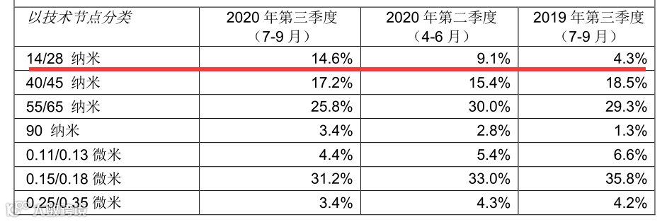 中芯国际先进制程(28nm及以下)业务收入占比进一步提高。公司第三季度先进制程收入占比达到14.6%,环比提高5.5个百分点,同比提高10.3个百分点。