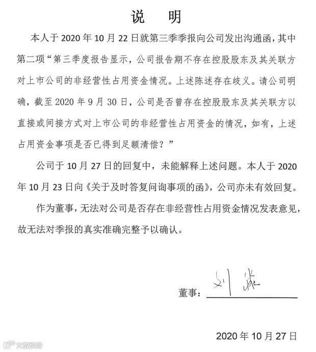 两名董事此次在说明中称,公司所声称报告期不存在控股股东及关联方占用上市公司非经营性资金这一陈述存在歧义。在10月27日对深交所回复中未能解释。