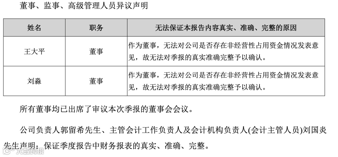 董事会会议文件显示,在披露三季报前夕,10月27日公司曾召集9名董事召开董事会,其中董事王大平、刘淼对三季报投出了反对票。对于反对理由,双方表示均是对非经常性资金占用无法表示意见。