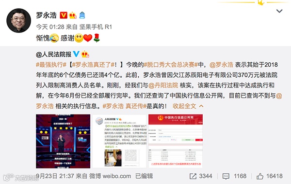 人民法院报官方微博发文称:此前,罗永浩曾因欠江苏辰阳电子有限公司370万元被法院列入限制高消费人员名单。经与丹阳法院核实,该案在执行过程中达成执行和解,在今年6月份已经全部履行完毕。目前在中国执行信息公开网上,已查询不到与罗永浩相关的执行信息。随后,罗永浩转发人民法院报此微博,并表示“惭愧,感谢。”