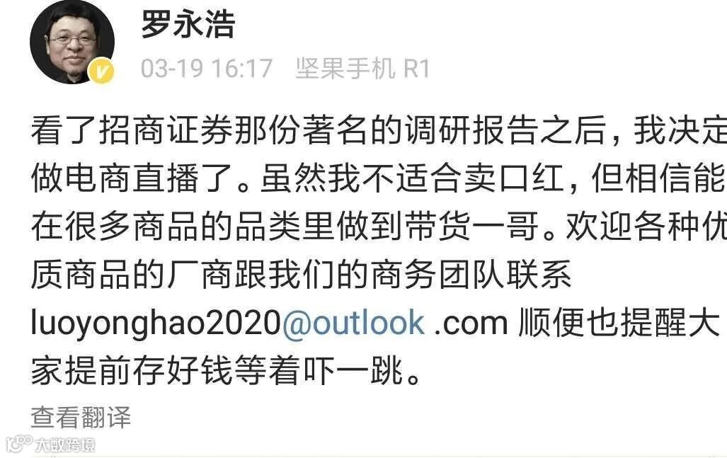 罗永浩3月19日在个人微博上宣布决定做电商直播。对于缘由,他称是在看了招商证券一份调研报告后决定的。“虽然我不适合卖口红,但相信能在很多商品的品类里做到带货一哥。”