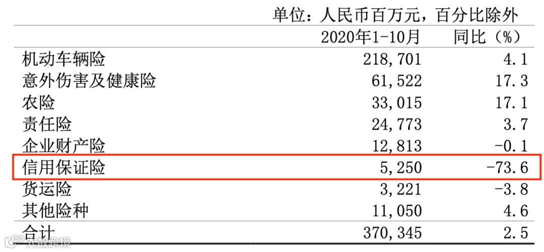日前中国人保发布的最新保费收入公告显示,2020年前10月,公司原保费收入4850.53亿元,同比增长2.85%。人保财险原保费收入3703.45亿元,同比增长2.52%;人保健康原保费收入288.42亿元,同比增长44.25%;人保寿险原保费收入858.66亿元,同比下降5%。财险中,信用保证险的同比变动格外引人注目,达到-73.6%。