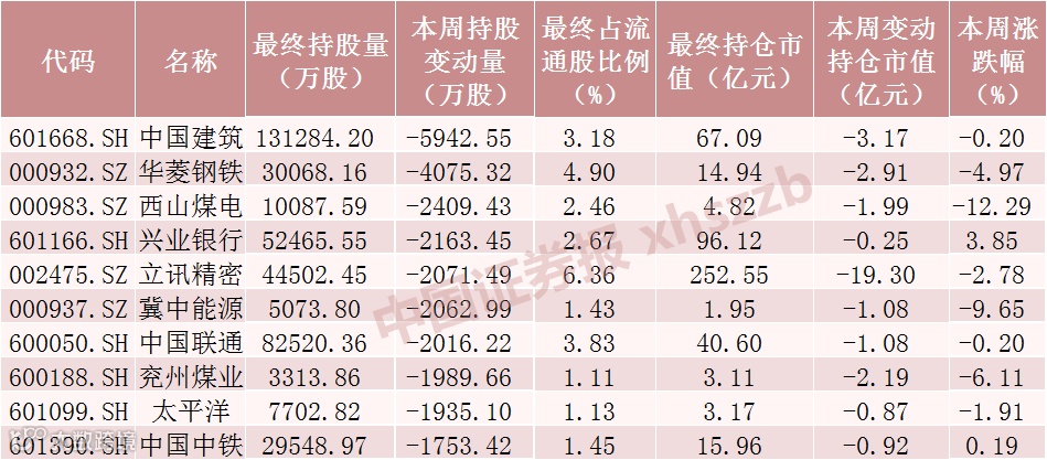 Choice数据显示,截至10月23日,北向资金持仓市值为1.94万亿元,本周持仓市值减少569亿元,共计减仓909只个股,对其中37只个股的减仓股数超过1000万股。减仓股数位居前三的中国建筑、华菱钢铁、西山煤电被分别减仓5942.55万股、4075.32万股、2409.43万股,此外北向资金对兴业银行、立讯精密、冀中能源、中国联通的减仓股数也超过了2000万股。