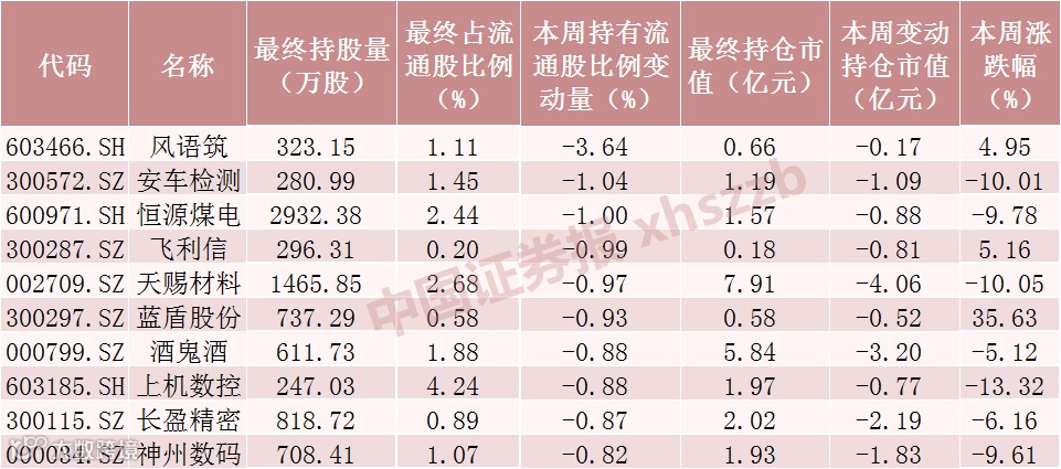 从持有流通股比例情况来看,Choice数据显示,本周北向资金对3只个股的持有流通股比例减少1%以上,分别为风语筑、安车检测、恒源煤电,持有流通股比例分别减少3.64%、1.04%、1.00%。从市场表现上来看,风语筑本周累计上涨4.95%,安车检测、恒源煤电累计下跌10.01%、9.78%。