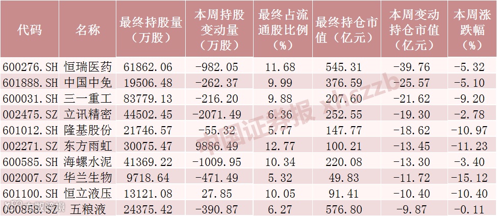 从持仓市值变动情况来看,Choice数据显示,本周北向资金对27只个股的持仓市值减少超过5亿元,对恒瑞医药、中国中免、三一重工持仓市值减少金额居前,分别减少39.76亿元、25.57亿元、21.62亿元。本周北向资金持仓市值减少额居前十个股中,除东方雨虹、恒立液压被北向资金增持外,其他个股均遭遇北向资金的减持。