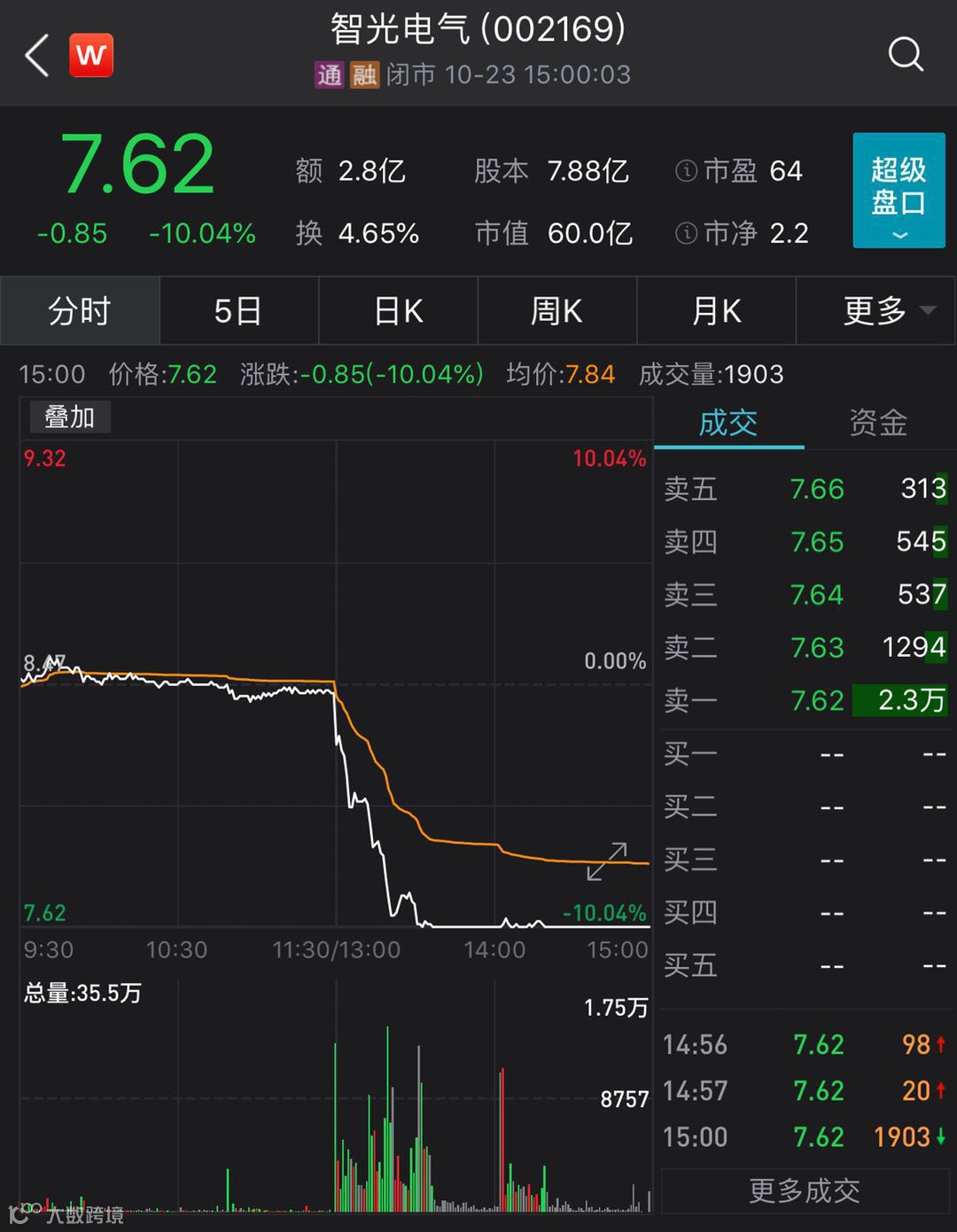 清仓减持公告发布后,智光电气10月23日午后股价直接闪崩,收盘股价封死跌停。