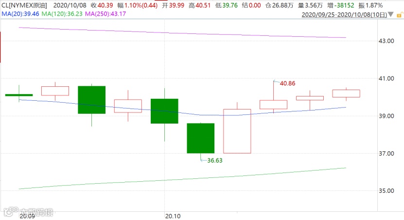 原油先跌后涨,截至10月8日16:00,NYMEX原油现已回到40美元/桶上方。