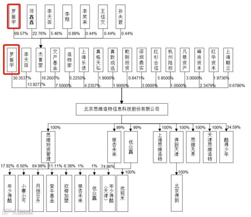 罗振宇是思维造物的创始人,目前也是公司控股股东、实际控制人、董事长。截至招股说明书披露,罗振宇通过直接及间接方式持有公司共计46.6144%的表决权。其中,罗振宇先生直接持有30.3537%股份,同时通过杰黄罡间接控制16.2607%的股份。