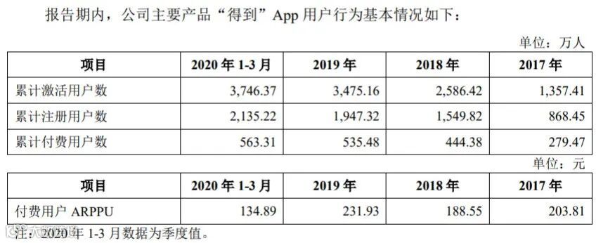招股书显示,截至2019年底,得到App累计付费用户535.48万人,付费用户ARPPU从2017年203.81元涨至231.93元。
