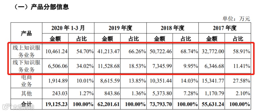 思维造物表示,公司从事的终身教育业务,是互联网信息技术行业、文化传播行业和教育行业交叉形成的细分行业。公司提供的主要服务包括线上知识服务、线下知识服务、电商和其他。2020年第一季度,线上和线下知识服务占营收比重近90%。
