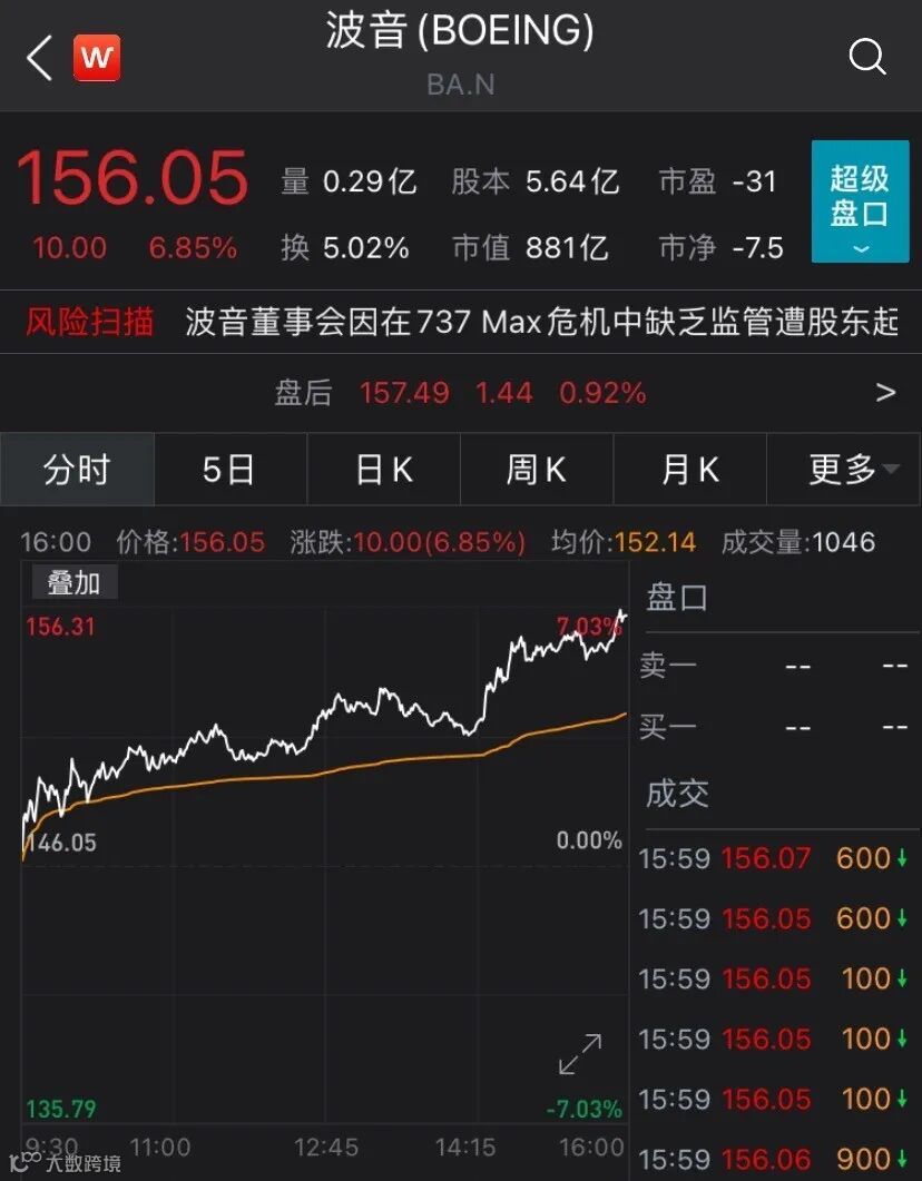 具体来看,波音当日高开高走,尾盘涨幅一度达到7%,遥遥领先其他道指成份股,最终收涨6.85%,创6月29日以来最大收盘涨幅,报收156.05美元/股,上涨10美元/股,仅一日市值就增加了56.4亿美元,截至收盘总市值为881亿美元。