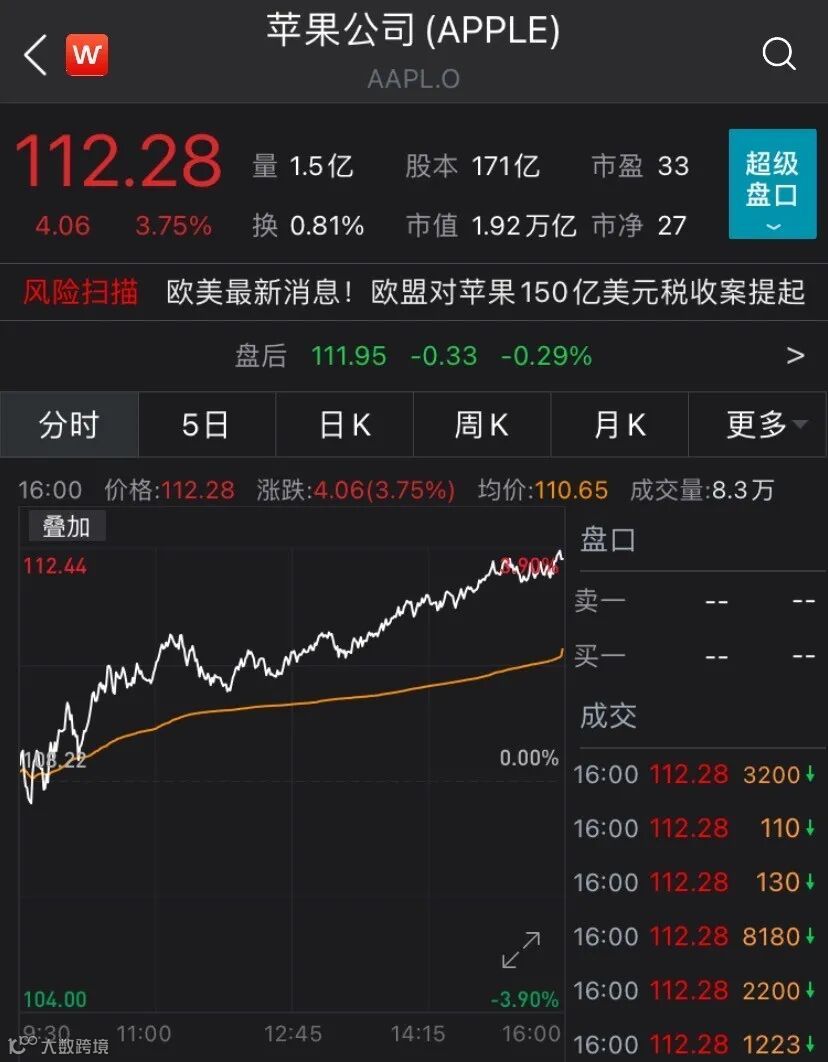 美国大型科技股集体上涨。截至收盘,苹果涨3.75%,亚马逊涨2.49%,奈飞涨2.07%,谷歌涨1.14%,Facebook涨2.12%,微软涨2.28%。