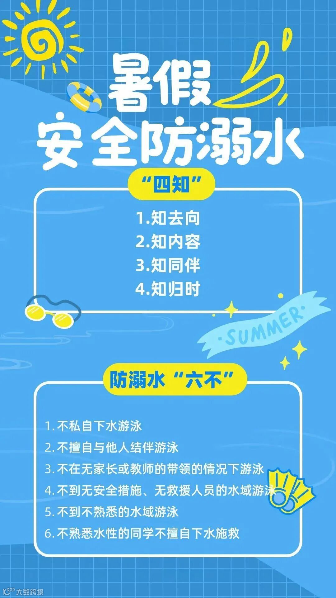 当前正值汛期,天气炎热,溺水事故进入高发期、易发期。请家长务必增强安全意识和监护责任,加强教育与管理,确保做到孩子外出“四知”:知去向、知内容、知同伴、知归时。同学们务必严格遵守防溺水“六不”要求:不私自下水游泳,不擅自与他人结伴游泳,不在无家长或教师带领的情况下游泳,不到无安全设施、无救援人员的水域游泳,不到不熟悉的水域游泳,不熟悉水性的学生不擅自下水施救。