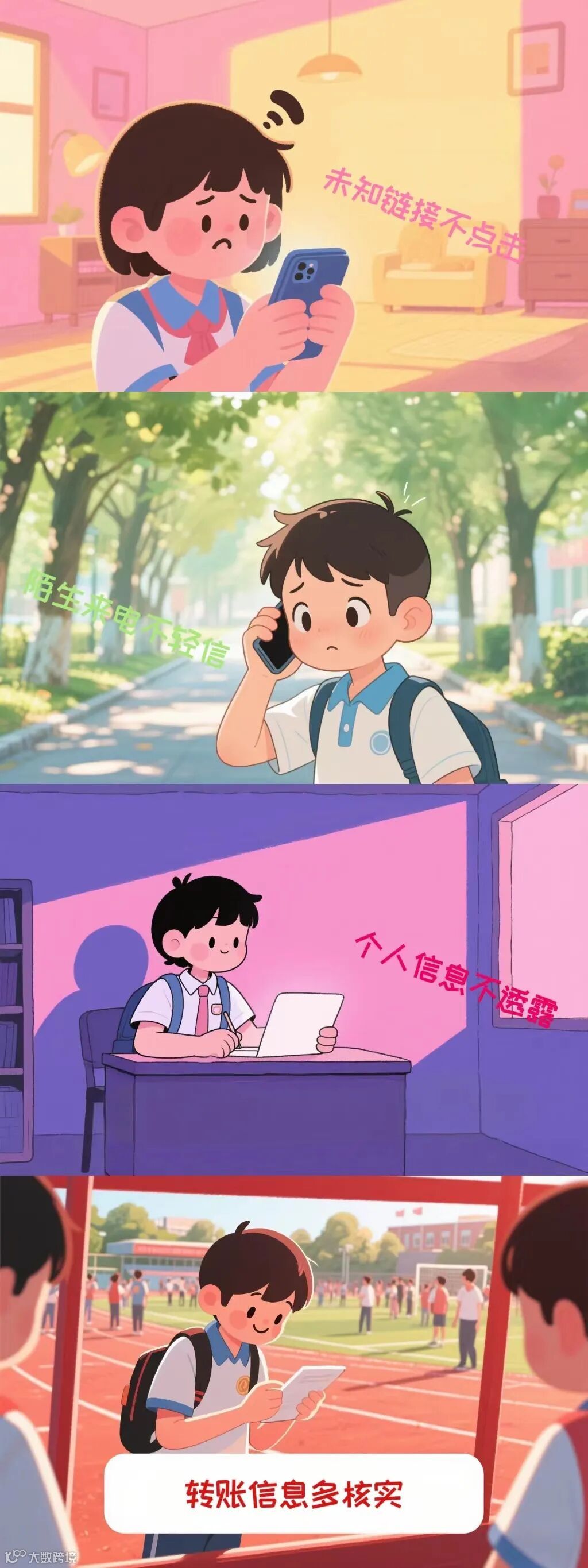 当前电信网络诈骗手段层出不穷,请同学们务必保持警惕,时刻牢记国家反诈中心“三不一多”原则,未知链接不点击、陌生来电不轻信、个人信息不透露、转账汇款多核实。安装“国家反诈中心”APP并开启预警功能,警惕“高薪兼职”“刷单返利”“助学贷款”等诱惑,不向陌生账户转账,妥善保管银行卡及验证码。