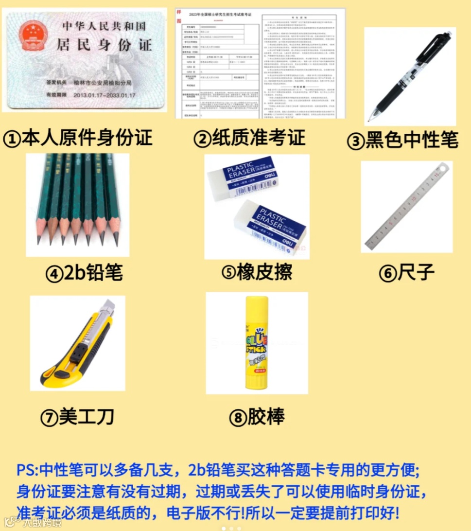 必备物品∶身份证、准考证、黑色中性笔、2B 铅笔、橡皮、小刀、胶水、尺子等,一定要提前准备齐全,装进透明文具袋。