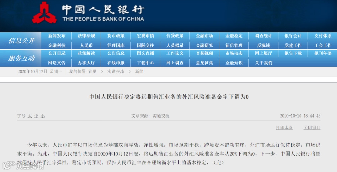 央行日前决定将远期售汇业务的外汇风险准备金率从20%下调为0,自今日(2020年10月12日)起正式执行。