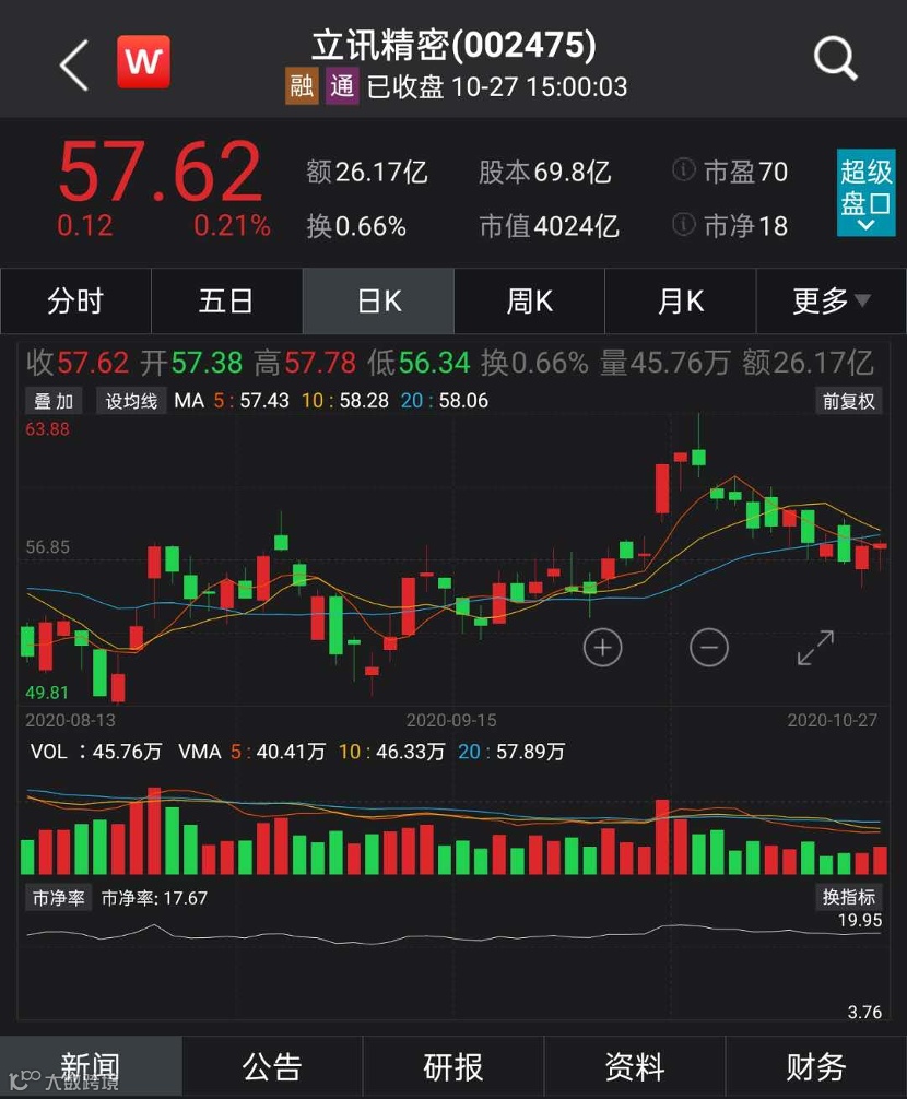 截至10月27日收盘,立讯精密报57.62元,总市值达4024亿元,市值在中小板中,仅次于海康威视。