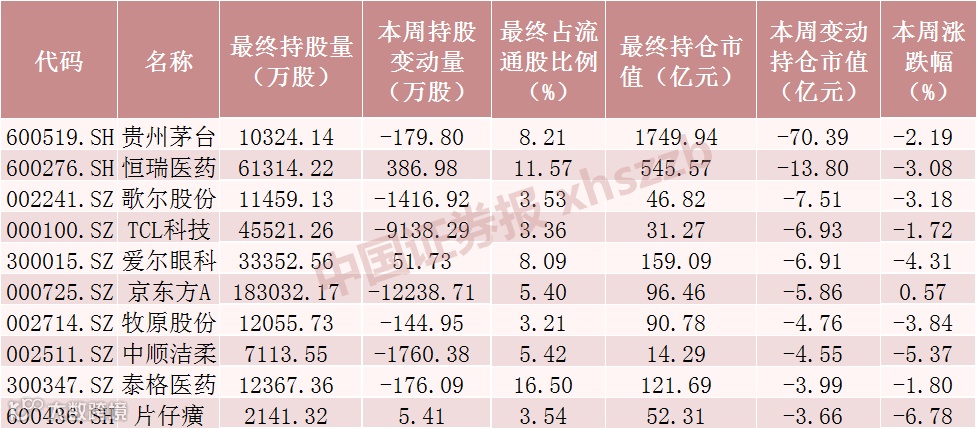 从持仓市值变动情况来看,Choice数据显示,本周北向资金仅对6只个股的持仓市值减少超过5亿元,分别为贵州茅台、恒瑞医药、歌尔股份、TCL科技、爱尔眼科、京东方A,持仓市值分别减少70.39亿元、13.80亿元、7.51亿元、6.93亿元、6.91亿元、5.86亿元。从市场表现上来看,本周北向资金持仓市值减少额超5亿的个股除京东方A外均下跌,爱尔眼科跌幅最大,本周累计下跌4.31%。
