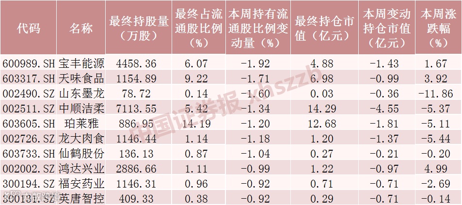 从持有流通股比例情况来看,Choice数据显示,本周北向资金对7只个股的持有流通股比例减少1%以上,对宝丰能源、天味食品、山东墨龙的持有流通股比例减少居前,分别减少1.92%、1.71%、1.60%。从市场表现上来看,北向资金持有流通股比例减少1%以上的7只个股中仅有宝丰能源、天味食品本周取得上涨,其他5只个股本周均下跌,山东墨龙本周下跌11.86%。