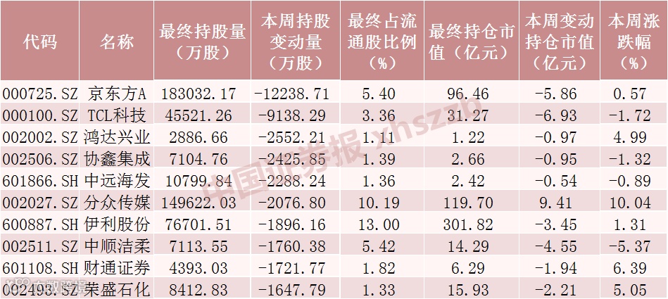 在北向资金本周加仓801只个股的同时,对一些个股进行了减仓操作。Choice数据显示,本周北向资金共计减仓693只个股,对其中22只个股的减仓股数超过1000万股。减仓股数最多的京东方A被减仓1.22亿股,此外TCL科技、鸿达兴业被分别减仓9138.29万股、2552.21万股,可见本周被减仓股数位居前两位的为“面板双雄”。