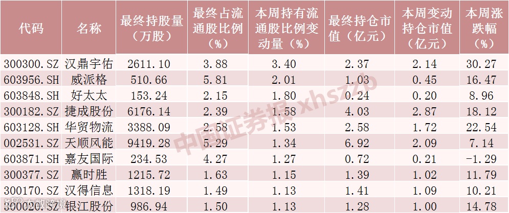 从持有流通股比例情况来看,Choice数据显示,本周北向资金对11只个股的持有流通股比例增加1%以上。其中对汉鼎宇佑持有流通股比例增加3.40%,对威派格、好太太、捷成股份、华贸物流的持有流通股比例分别增加2.01%、1.80%、1.58%、1.53%。