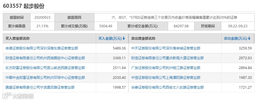 值得注意的是,Wind数据显示,在五连板期间,起步股份分别于9月18日、21日、23日3次登上龙虎榜,买入和卖出前五席位多数为券商营业部。其中,9月17日-9月21日3个交易日累计成交额6559.56万元,9月22日、23日两个交易日累计成交额8.43亿元,仅9月23日全天成交额就达8.08亿元。