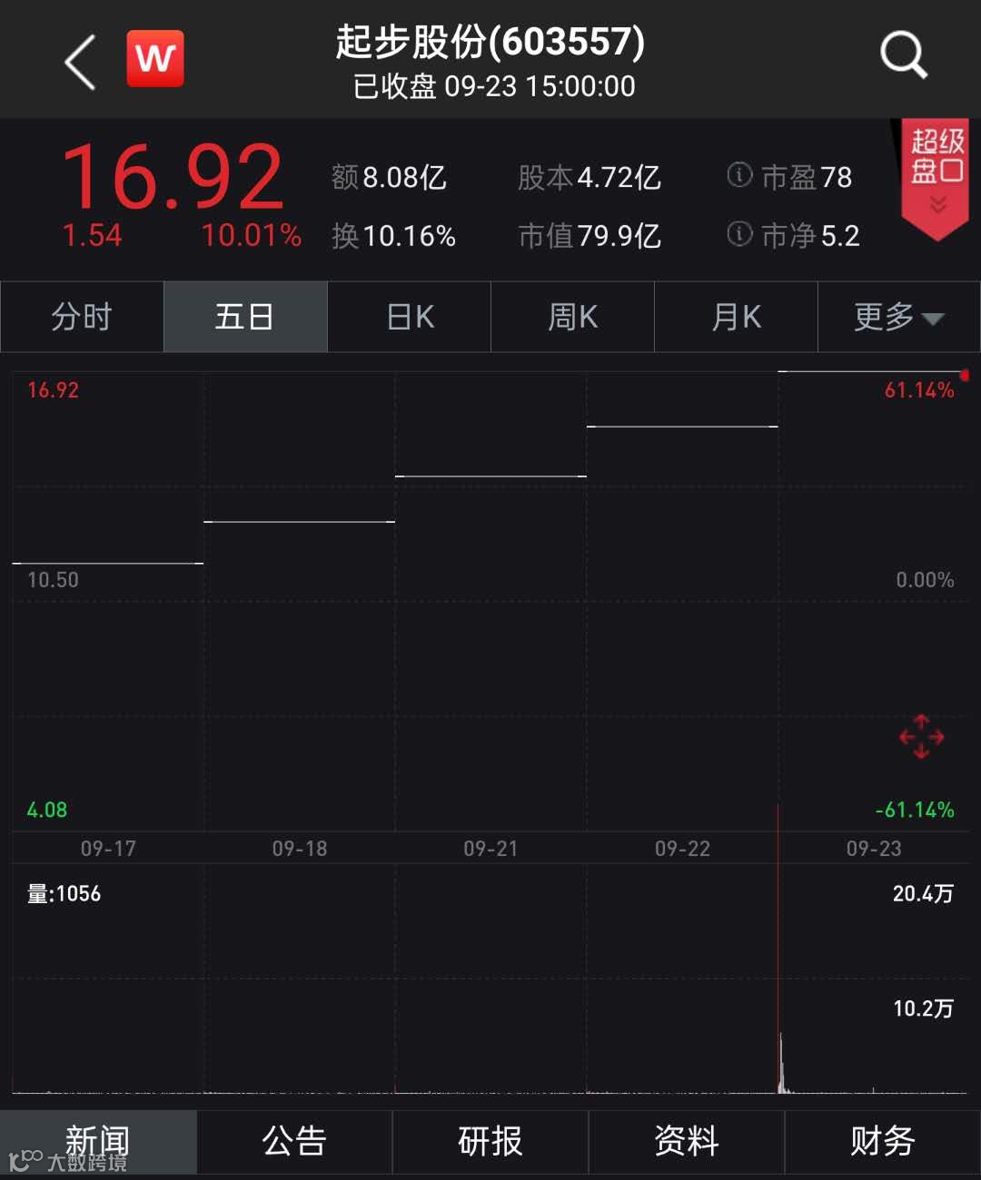 Wind数据显示,起步股份的总市值从9月16日收盘的49.56亿元上涨至23日收盘的79.86亿元,5个交易日市值大涨30.3亿元。