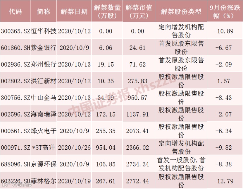 在10月面临限售股解禁的116只个股中,恒华科技、紫金银行、郑州银行等个股解禁压力较小,解禁市值均不足100万元。其中紫金银行解禁市值为24.61万元,该股10月9日将有6.06万股解禁,为首发原股东限售股解禁,郑州银行10月13日解禁的19.15万股也为首发原股东限售股解禁。