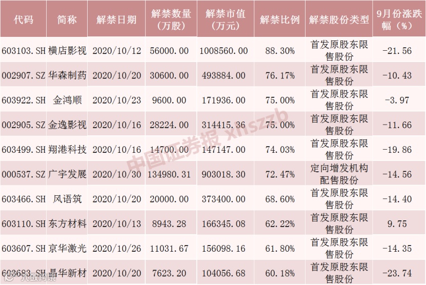 Wind数据显示,在10月面临限售股解禁的116只个股中,有24只个股解禁股数量占总股本比例超过50%,其中横店影视、华森制药、金鸿顺解禁比例居前,分别为88.30%、76.17%、75.00%,均为首发原股东限售股解禁。