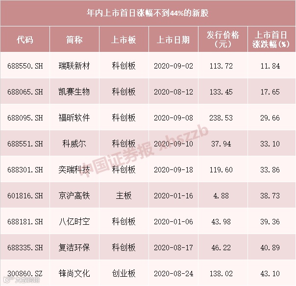 Wind数据显示,在今年上市的非注册制新股中,仅京沪高铁与中谷物流两只个股上市首日即开板。注册制新股中,有8只新股上市首日涨幅不到44%,其中瑞联新材上市首日仅收涨11.84%,凯赛生物上市首日涨幅也不到20%。