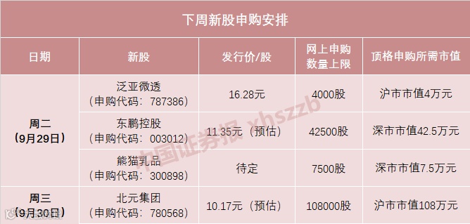 其中,下周三申购的沪市主板新股北元集团,网上申购数量上限为108000股,在今年发行新股中排名第6,顶格申购需配沪市市值108万元。