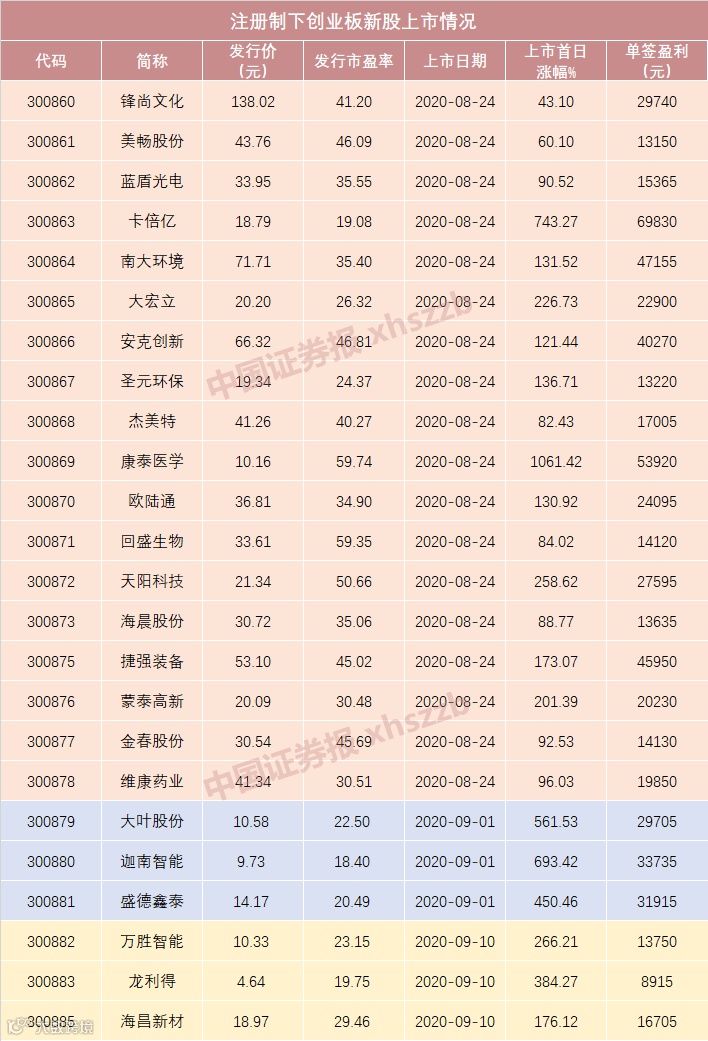 相比之下,注册制下创业板第二批3只新股的首日涨幅都在450%以上,单签盈利均在3万元左右。而首批18只新股的上市首日平均涨幅为212.37%,其中5只新股的单签盈利超过4万元,卡倍亿的单签盈利高达6.98万元。