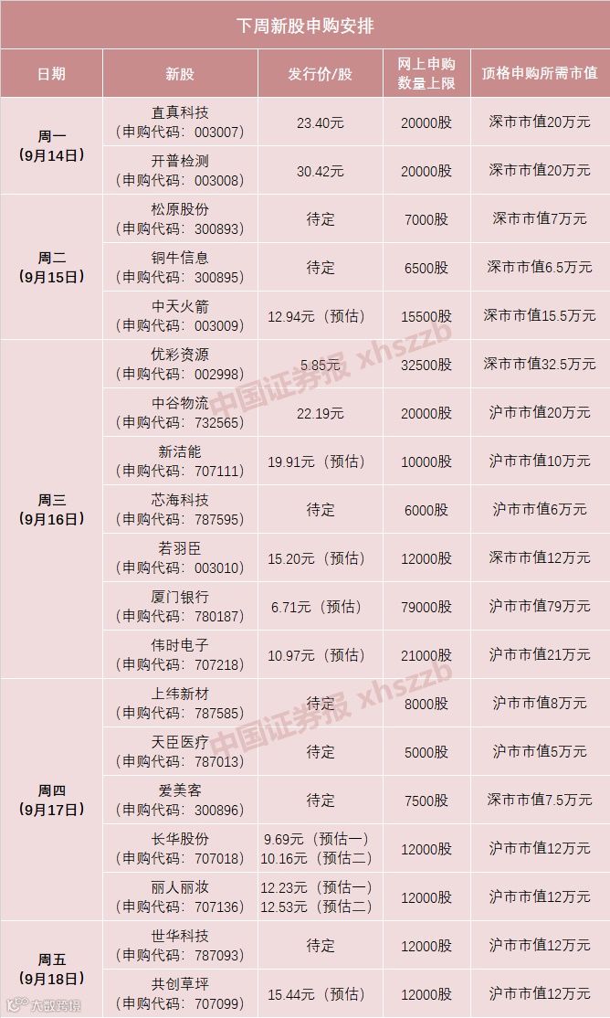 根据新股发行安排,下周(9月14日至9月18日)A股将有19只新股申购,其中沪市主板7只、中小板5只、创业板3只、科创板4只。19只新股合计发行数量约9.32亿股,预计募集资金共计135.37亿元。
