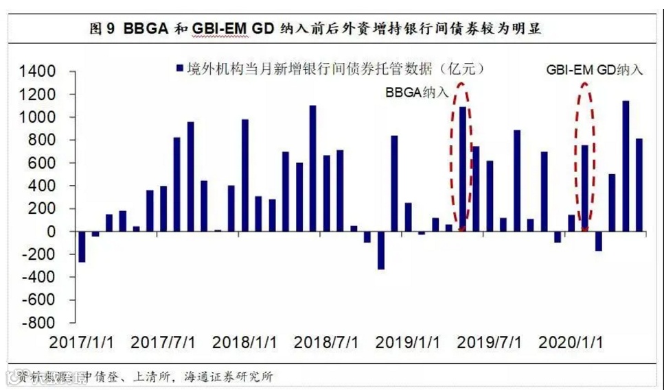 BBGA纳入后一个月(即2019年5月)外资增持银行间债券1093亿元(单位:人民币,下同),前一年同期为605亿元;GBI-EM GD纳入当月(2020年2月)外资增持银行间债券756亿元,前一年同期为-25亿元。