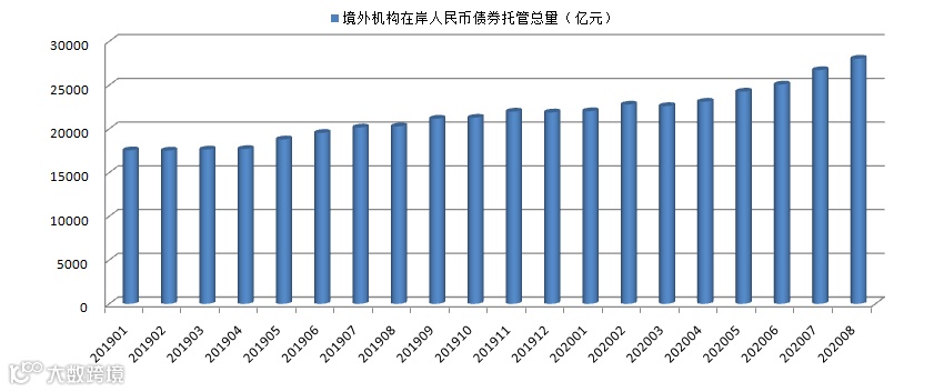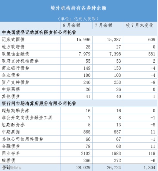 截至8月末,境外机构持有2.8万亿元中国债券,持有量占中国债券市场余额2.86%。